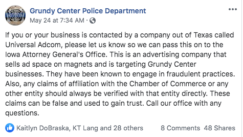 This company said the were working with the Police Dept. and the Grundy Center Chamber-Main Street, and both organizations have stated that they have no affiliation with Universal Adcom.
