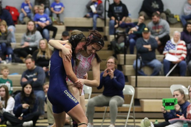 Leila Wedgwood was 2-1 on the mat with a win by fall and a 6-4 decision against Sumner-Fredericksburg’s Mae Wedemeier.