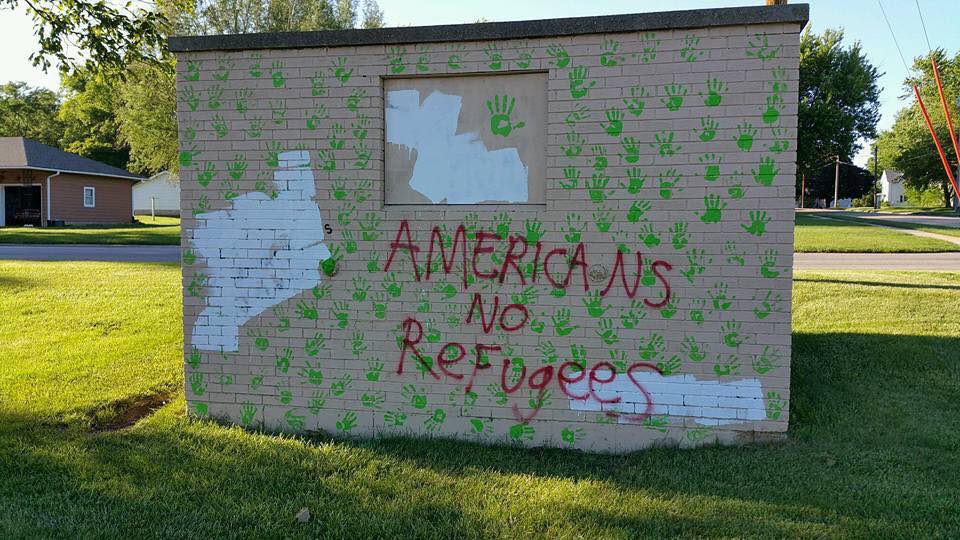 The unknown vandal used a can of red spray paint to write “Americans No Refugees” across the mural.